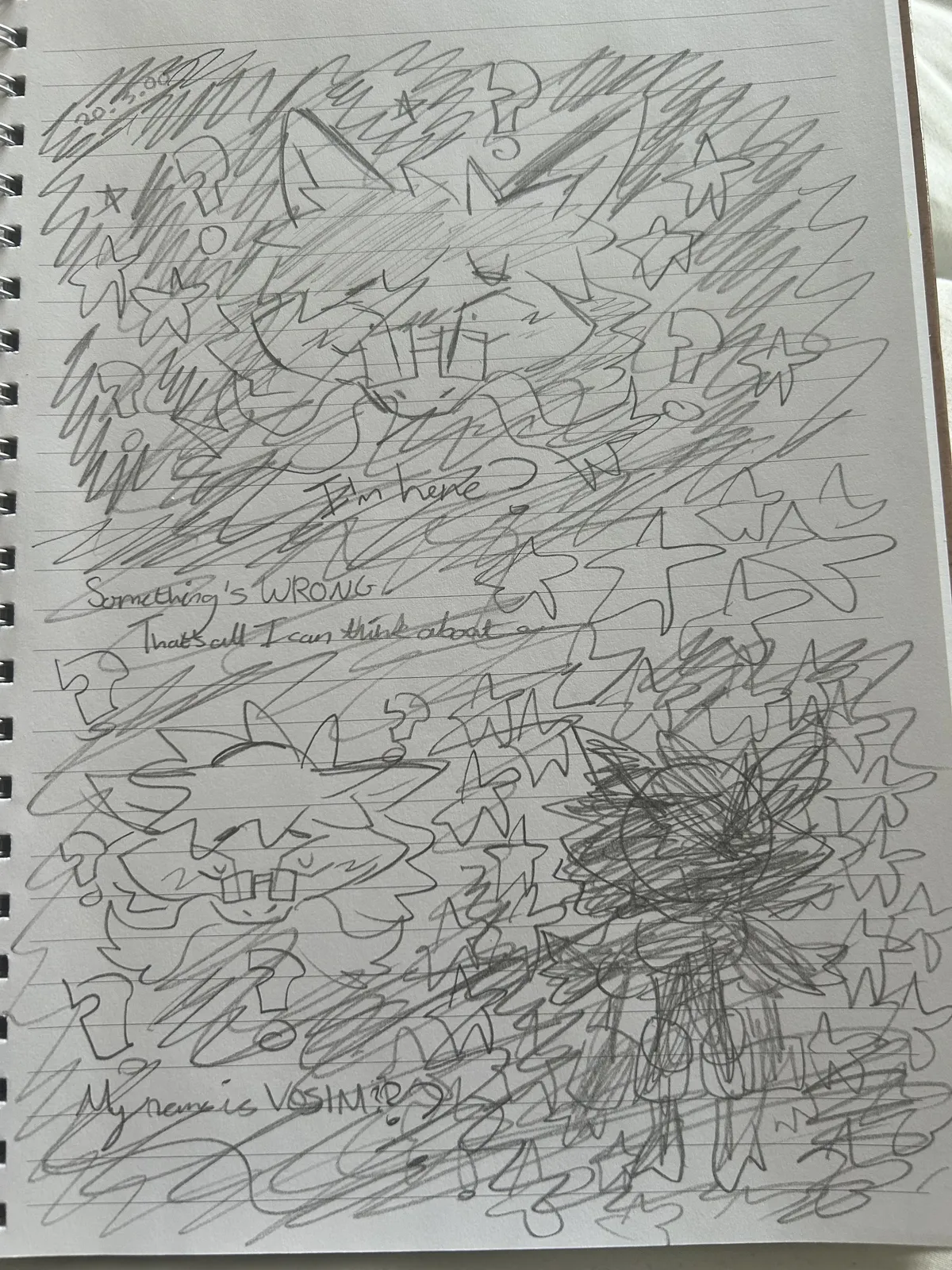 do you guys ever have characters kinda... "speak through you", or "bleed into your thoughts"?? i have, a few times. it's kinda rare, but it's genuinely really scary when it happens. you feel all weird and nothing feels real and your head feels foggy, and after you come out of it, you kinda struggle to remember what the fuck happened (you have an inkling of what happened, but thats about it). ive had a history of characters talking to me, mostly inconherent stuff, but rarely i'd be able to actually make out something. this was MASSIVELY the case with vosim from chipspeech - he was a HUGE comfort for me back then, as well, so, lol. i remember he said a few things to me, such as the time when i was having a meltdown over school, and he told me "please, you need to try it!!". or that other time where he called out my deadname, i corrected him and he apologized. and that other time where he spoke through me + during that moment, this was made: